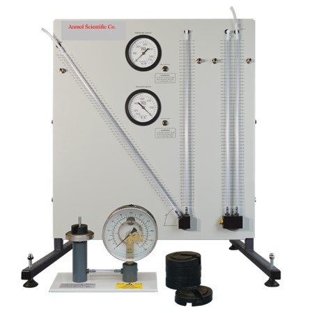 The manometer panel contains 2 tubes, 2 dial manometers, and one pressure transducer for the demonstration of alternative measurement methods. Test pressures in the millibar range are generated with the aid of the supplied syringe and or hand pump. All manometers can be combined with one another using connecting hoses. It is possible to measure gauge pressure and vacuum. The unit is also supplied for detecting deviations in a measuring instrument compared to a reference instrument or universally accepted standard value. This observed deviation is taken into account in the subsequent use of the calibrated measuring instrument and adjusted if necessary. A dead Weight Pressure Calibrator is a device designed as an introduction to the basics of checking and calibrating a manometer. Dead Weight Pressure Calibrator apparatus consists of a precision machined piston and cylinder assembly mounted on leveling screws. A Bourdon gauge is supplied for calibration.